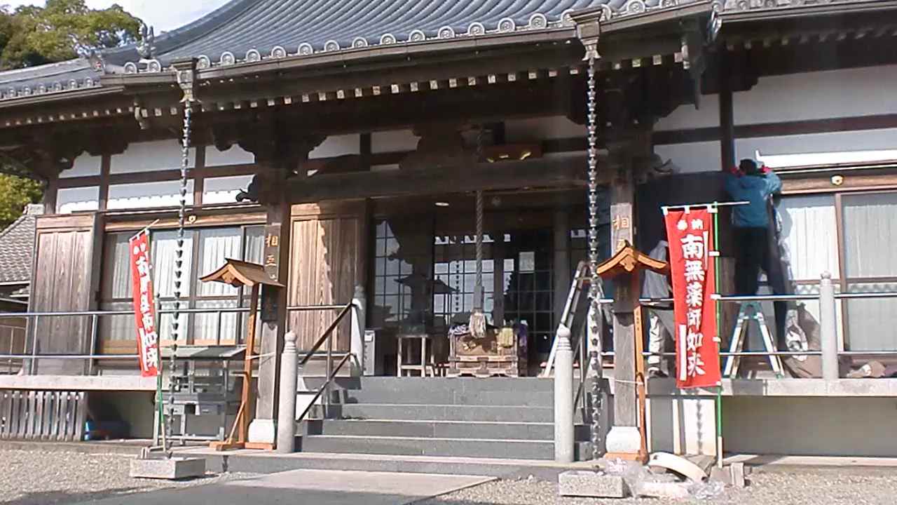 本堂と山門と観音堂、鐘撞き堂の飾り付けですがビデオにとれたのは本堂だけでした。本日は天気が良く風もなく世話人の方も多く参加して短時間で作業が終わりました。